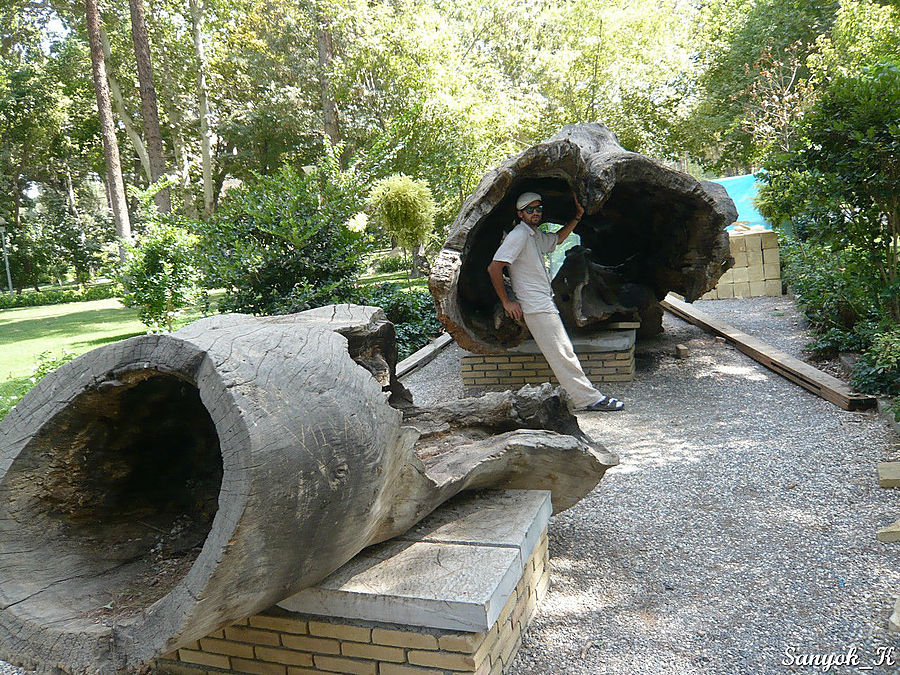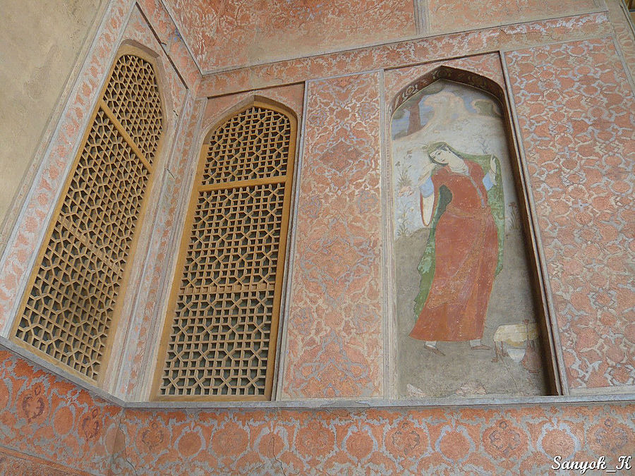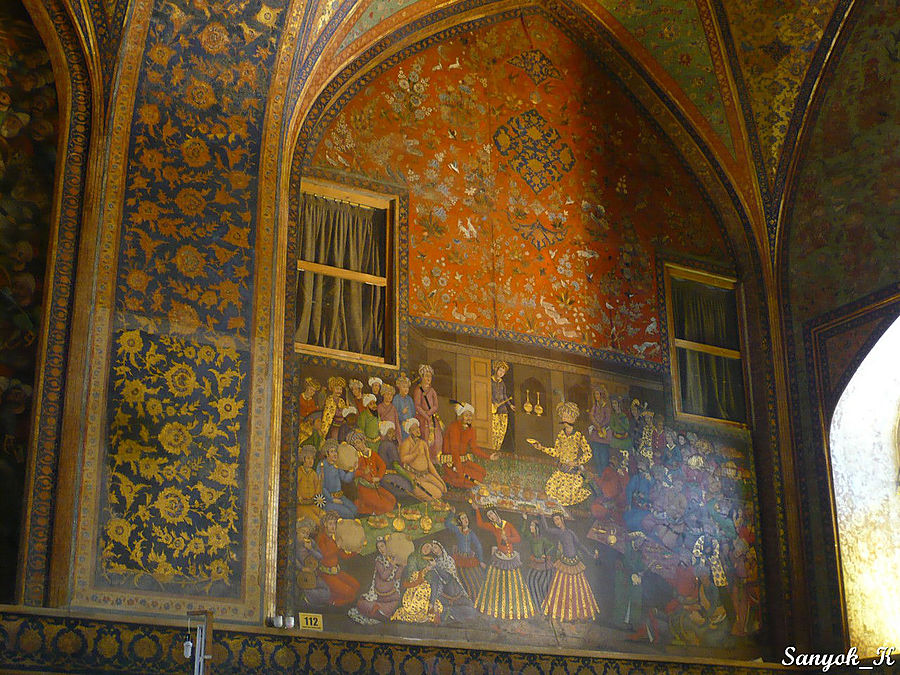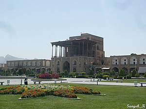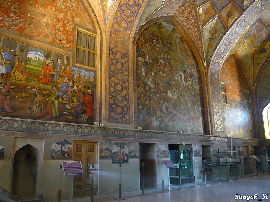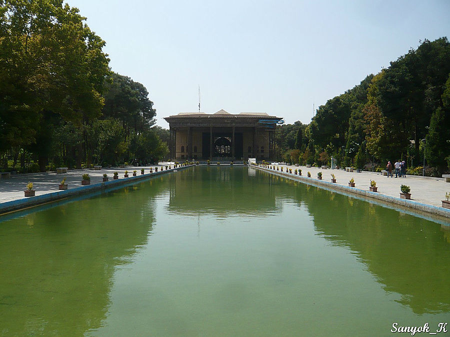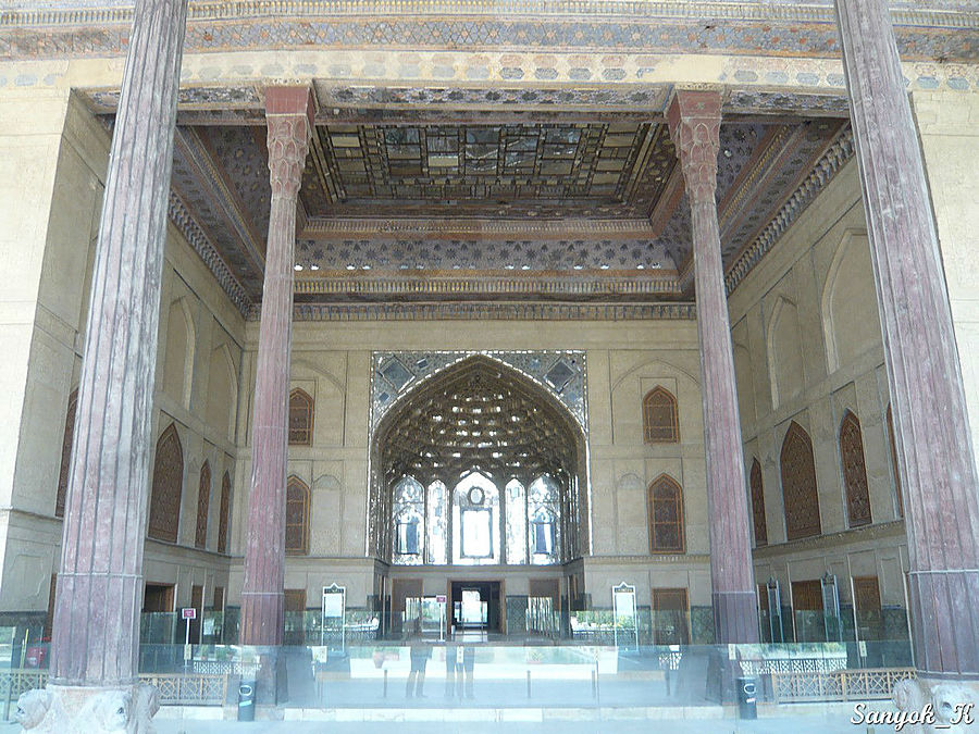 Недалеко от площади находится Дворец сорока колонн (Чехе́ль Соту́н). Говорят, что когда колонны отражаются в водоеме напротив, создаётся иллюзия, что колонн — сорок. Во дворце сохранилось множество фресок. Как объяснил нам экскурсовод, желтый цвет на картинах – чистое золото, которого для оформления интерьера было израсходовано несколько килограммов. В одной из комнат дворца хранится Коран 9 в. с печатью Имама Хассана, а в саду лежат окаменелые деревья.