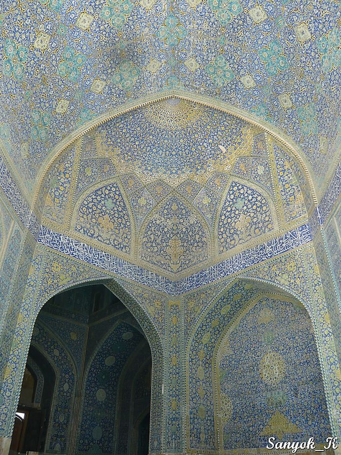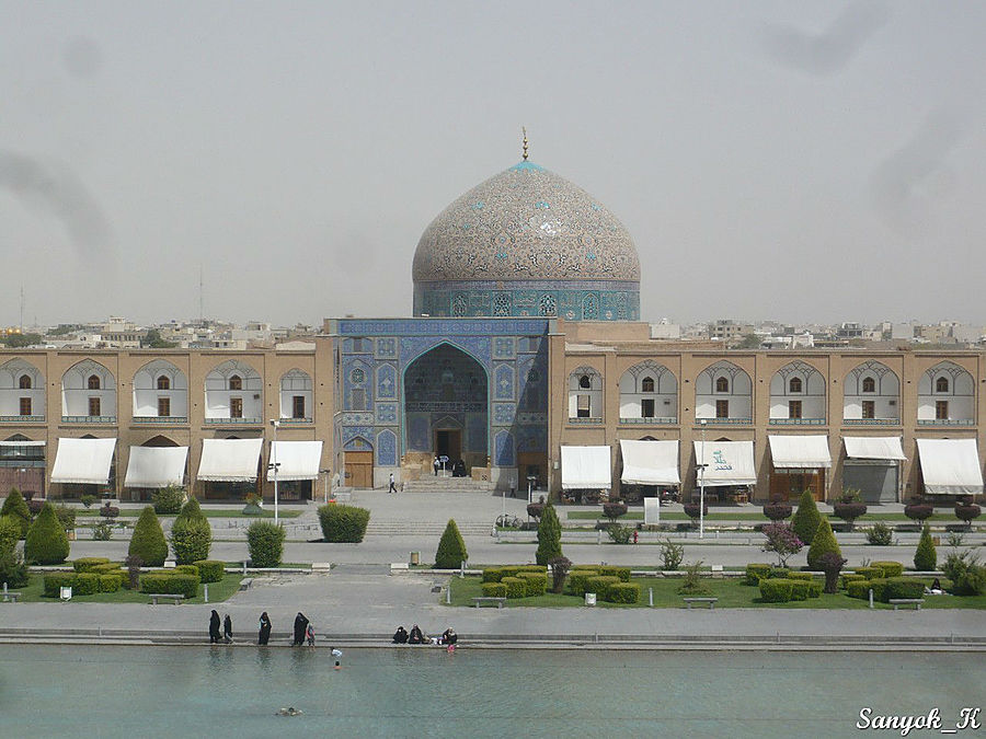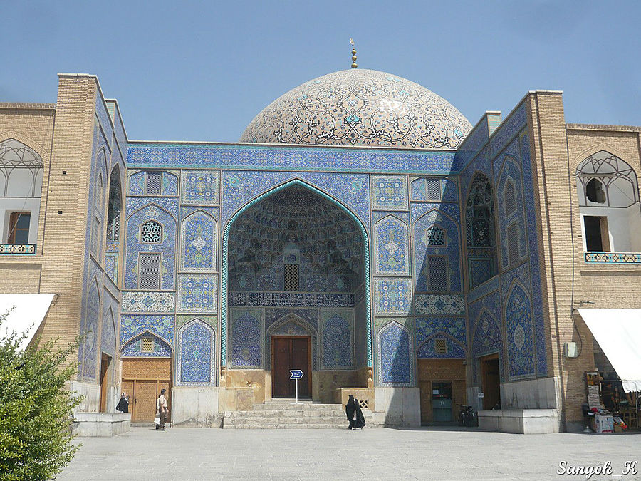 На восточной части площади находится Мечеть Шейха Лютфаллы́ (Масджи́д э шейкх Лотф-Олла́х), самая знаменитая мечеть Ирана и визитная карточка Исфахана. Обратите внимание на михра́б и решетчатые окна, богатую отделку, сложную мозаику и каллиграфию. Самое лучшее время для посещения – рассвет или закат, когда помещение окрашивается лучами солнца и меняет свой цвет от розового до оранжевого.