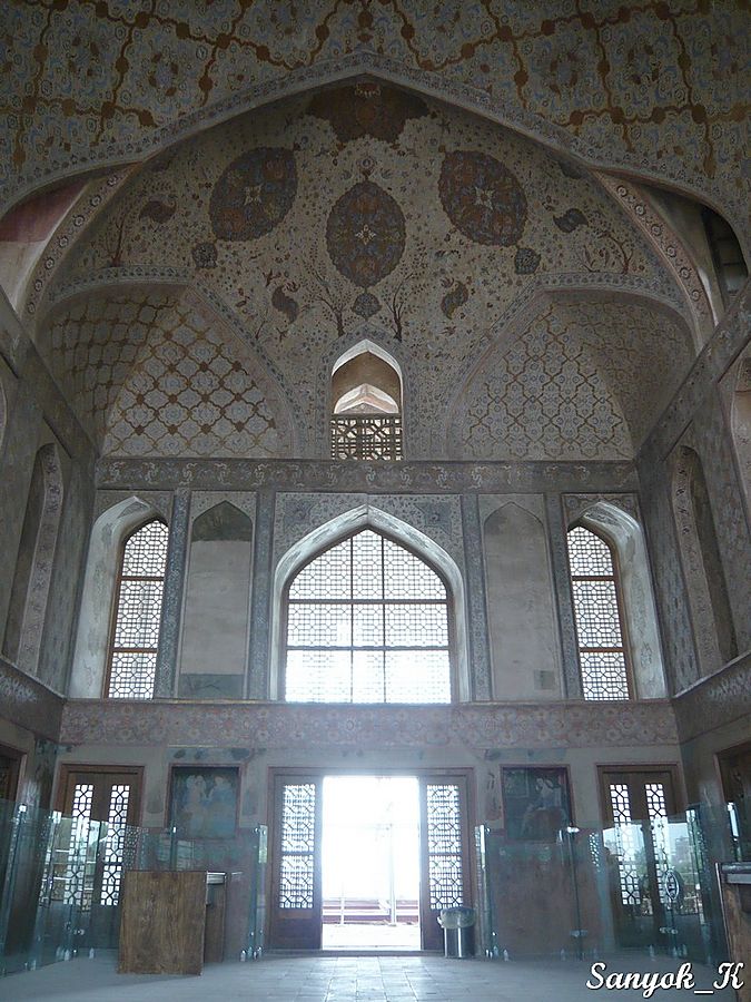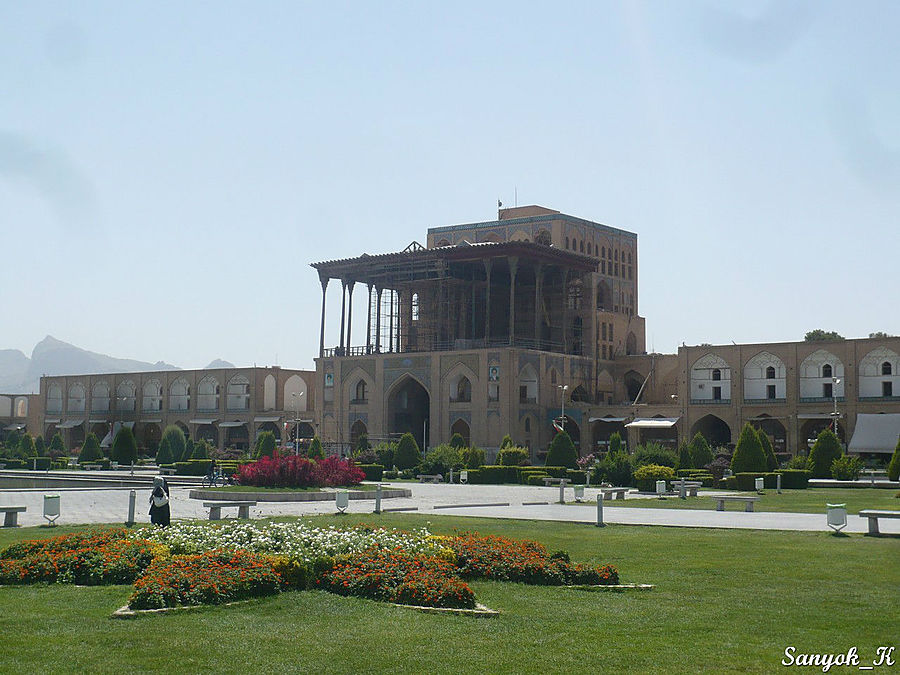 Напротив мечети находится Дворец Али́-Гапу́ (Ворота Али). Самое интересное, что можно там сделать — это подняться на верхний этаж и осмотреть музыкальную комнату, в стенах и потолках которой вырезаны углубления в форме ваз, а после можно выйти на террасу и сделать красивые фотографии площади. На многих стенах восстановлена старая роспись и фрески.