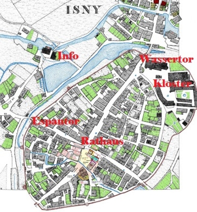 Главная ее достопримечательность — Ратуша (Rathaus), ето не один дом, а несколько средневековых зданий (15-17 веков). Собственно здание старой ратуши, сохранившееся с 15 века, одно из немногих в Исни, переживших 30-летнюю войну. Большинство зданий в старом городе относятся к концу 17 века и позже.