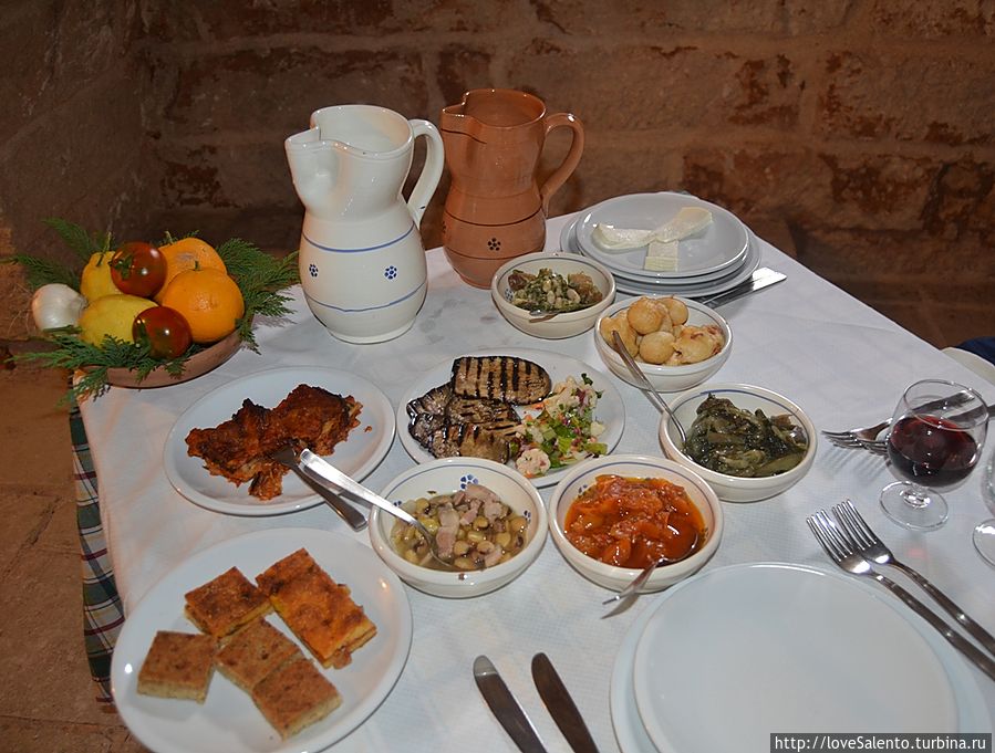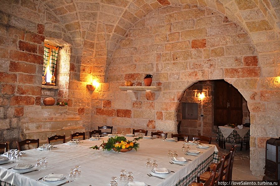 Это также ресторан, очень необычный, поскольку в нем нет меню, тут можно попробовать традиционные блюда Саленто (все в керамической посуде), начиная от обильного количества закусок (antipasti) и вина (произведенного в массерие), потом вам подадут различные виды пасты, мясо (различные виды и приготовленне различными способами), фрукты, десерты, кофе и ликеры (также сделанные в массерие). Порции довольно большие, так что будьте готовы съесть много Цены средние, персонал очень доброжелательный и вежливый. Есть много живописных комнат внутри, и очень красивая летняя площадка снаружи, здорово прогуляться после обеда / ужина вокруг массерии (также с гидом).