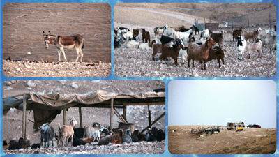 Правее бедуинское поселение. Какие – то времянки, козы. Осел, который пасется у стоянки, скорее всего, их достояние.