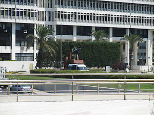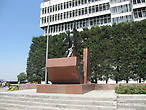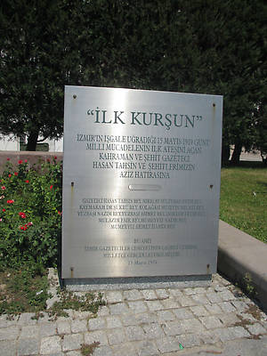 Наше внимание привлёк памятник, и мы подошли поближе, чтобы его рассмотреть и сфотографировать. Мы были уверены, что это памятник Ататюрку, но оказалось, что человек, сжимающий знамя и пистолет, — писатель и журналист Осман Хасан Тахсин (1885-1919), призывавший к сопротивлению греческим войсками в момент их высадки в Измире и погибший от пули 15 мая 1919 года. Памятник был установлен в годовщину этого события 15 мая 1973 года и является символом сопротивления турков греческой окупации.