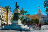 Эта величественная с размахом «разгребенная» (уверена, что для ее строительства пошел под снос не один особнячок) площадь, сильно контрастировала, с узкими, потрепанными улочками Кадиса. Конечно, она же Центральная – к ней все внимание. Здесь опять много деревьев, в Кадисе вообще какая-то своя мода площади деревьями засаживать. На площади можно увидеть мемориальную доску. Именно отсюда 5 сентября 1493 года отправляется к Американским берегам вторая экспедиция Колумба. В ходе этой экспедиции был проложен наиболее удобный морской путь в Вест-Индию. Так, через Кадис в Испанию потекло заокеанское золото. Экономический подъем, который переживает город в эту эпоху, становится толчком для роста инфраструктуры Кадиса, и город по тем временам уже не казался страшненьким и убогеньким, у Кадиса появилось свое лицо, свой стиль.