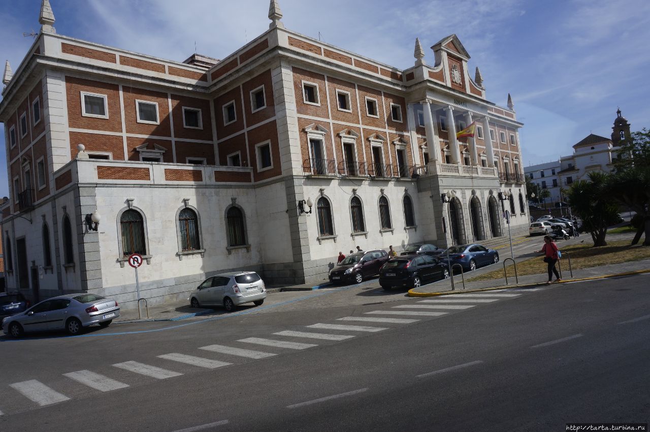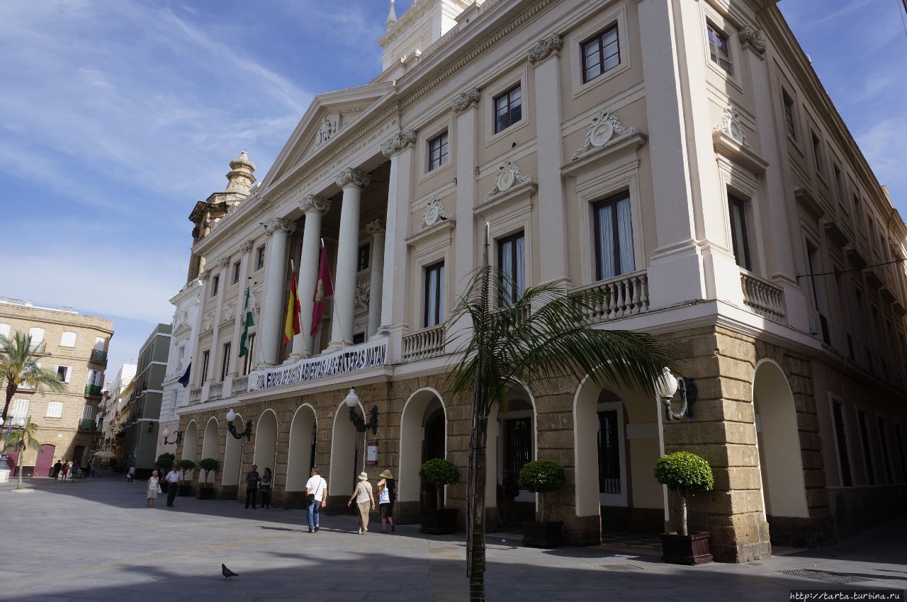 После главного религиозного сооружения Кадиса нас вывели к зданию городской Мэрии (Ayuntamiento de Cadiz), расположенной на площади Пласа-де-Сан-Хуан-де-Диос. Оно строилось в 2 этапа и тоже возникло на фундаменте старой ратуши, бывшей здесь прежде. Возведение завершилось в 1799, хотя внутренняя отделка продолжалась еще 62 года, и лишь в 1936 году над зданием впервые взметнулся флаг Андалусии.