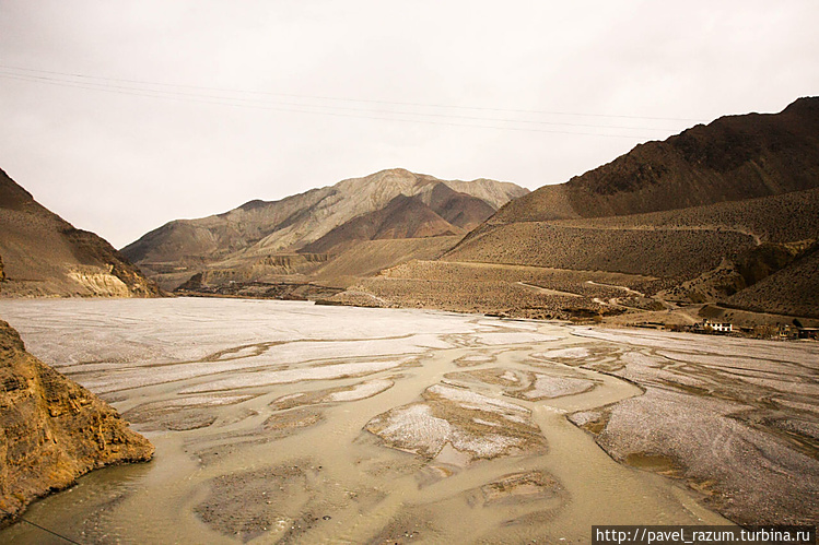 Да, немец не дал соврать! Наверху у ступы вид был действительно обалденный, даже несмотря на то, что сегодняшний день выдался облачным. Сверху мы обозревали долину Кали-Гандаки, всё Кагбени, как на ладони, семитысячник Нилгири, вершина которого сегодня была закрыта туманом. С другой стороны высились не менее красивые горы малиново-красно-коричневых оттенков с белоснежными шапками. Пейзажи здесь напоминали марсианские! По сути, мы находили уже почти в Тибете, до которого здесь было рукой подать. От Кагбени до Муктинатха местность была заселена преимущественно тибетцами. Здесь была тибетская религия, быт и культура. Можно сказать, мы были в непальском кусочке Тибета. Область эта называлась Мустанг. По нему мы и совершали наше пешее путешествие.