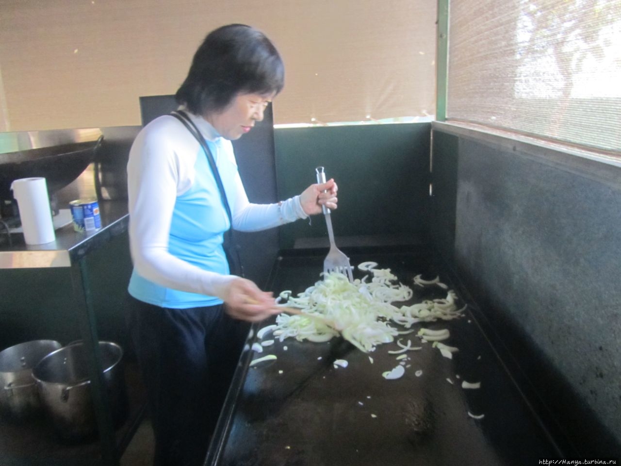 В помощники к нему вызвалась китаянка, которая ловко помешивала жарящийся лук.