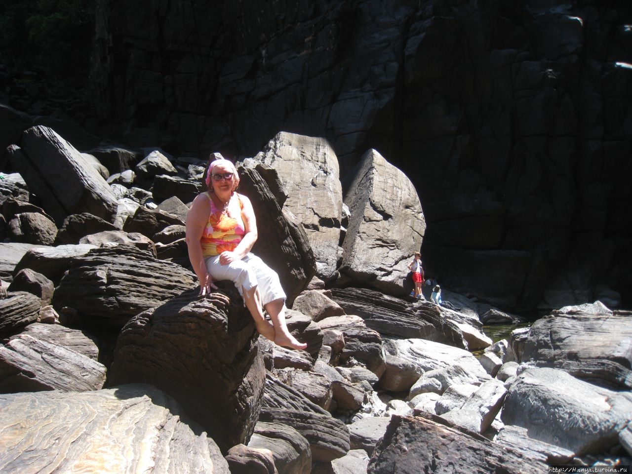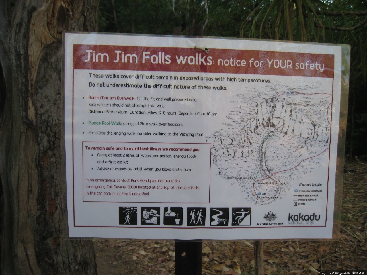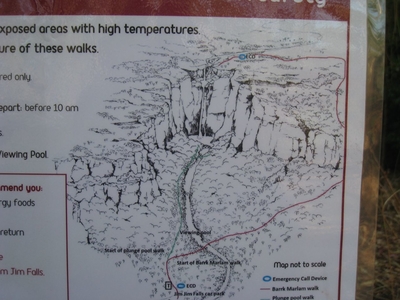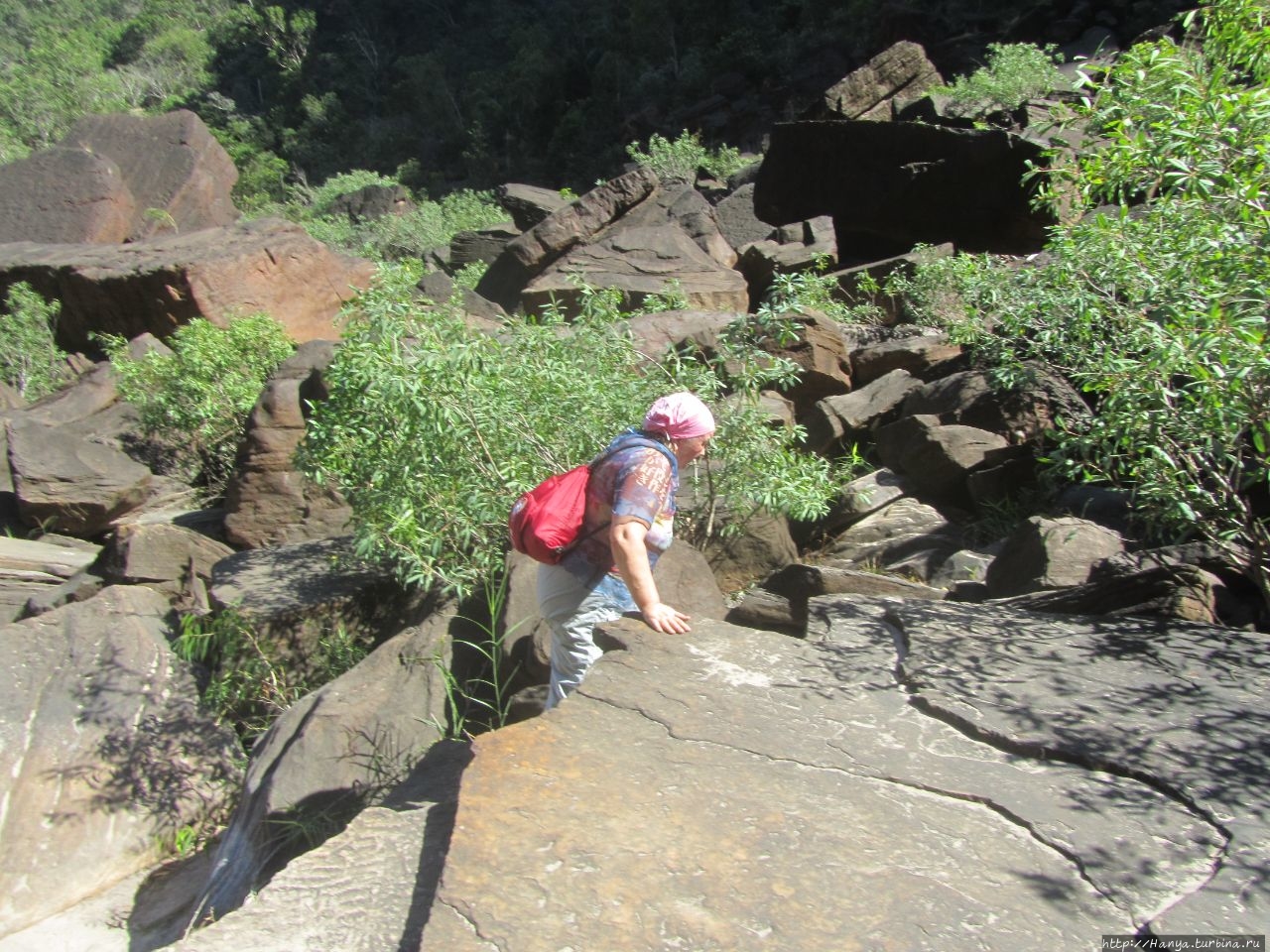 Только дома я внимательно прочла, что там было написано, и запоздало подумала, пошла ли бы я, прочитав все это своевременно. Щит с информацией о безопасности гласил, что путь к водопаду нелегкий, особенно при высокой температуре воздуха. Для исключения солнечного удара с собой надо тащить не менее 2 л воды, энергетический перекус и аптечку первой помощи. Осуществить ознакомление с водопадом можно как сверху, так и снизу. Поход к вершине водопада (Barrk Marlam Bush Walk) самый сложный, длиной 6 км, на него допускаются только подготовленные люди. Одиночки к походу не допускаются (кем?). Наш же маршрут Plunge Pool Walk был длиной 2 км, но по boulders (валунам)!