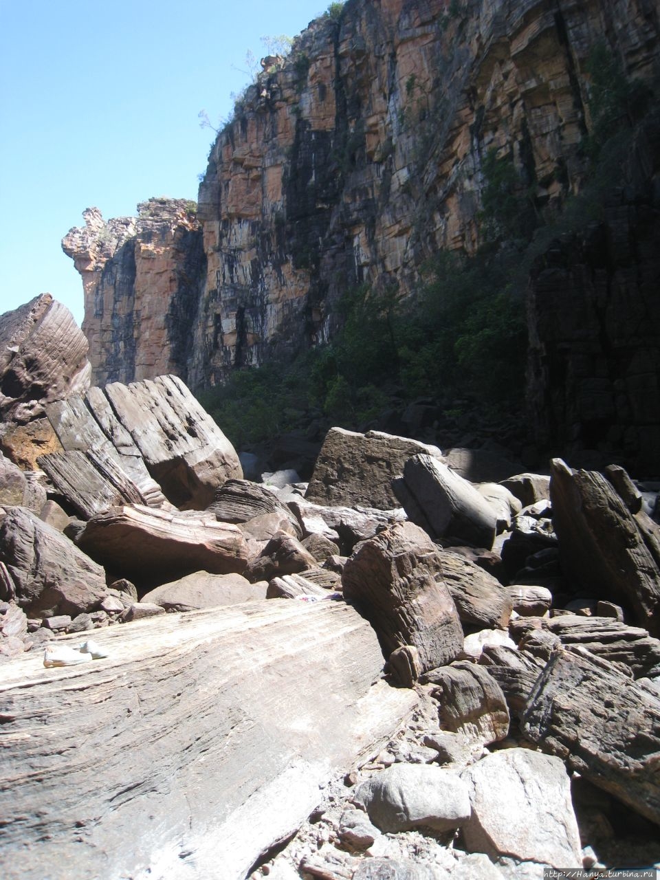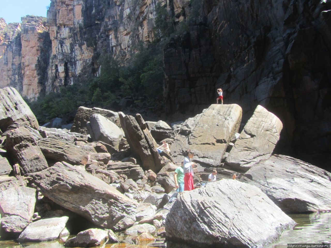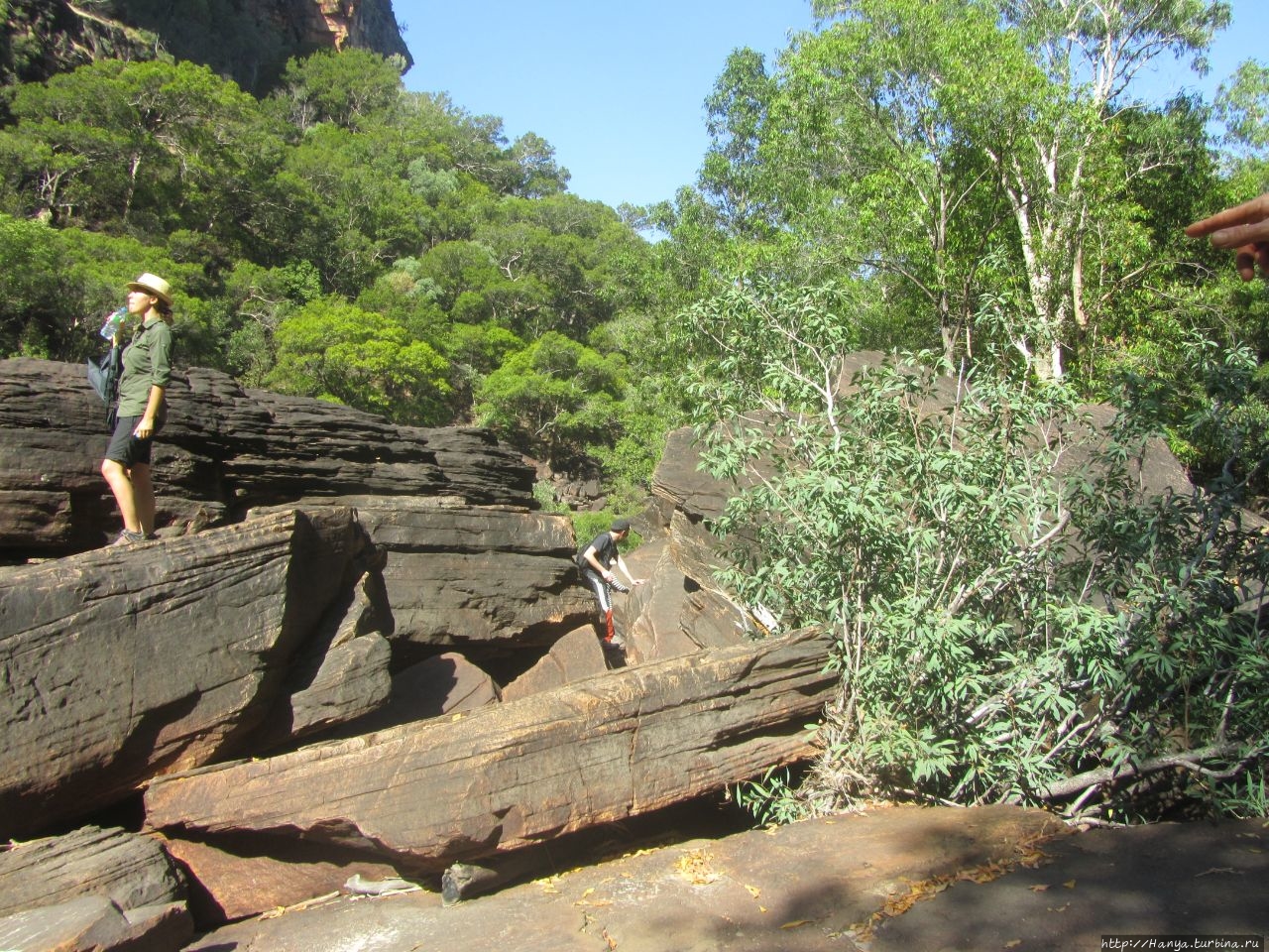 Только дома я внимательно прочла, что там было написано, и запоздало подумала, пошла ли бы я, прочитав все это своевременно. Щит с информацией о безопасности гласил, что путь к водопаду нелегкий, особенно при высокой температуре воздуха. Для исключения солнечного удара с собой надо тащить не менее 2 л воды, энергетический перекус и аптечку первой помощи. Осуществить ознакомление с водопадом можно как сверху, так и снизу. Поход к вершине водопада (Barrk Marlam Bush Walk) самый сложный, длиной 6 км, на него допускаются только подготовленные люди. Одиночки к походу не допускаются (кем?). Наш же маршрут Plunge Pool Walk был длиной 2 км, но по boulders (валунам)!