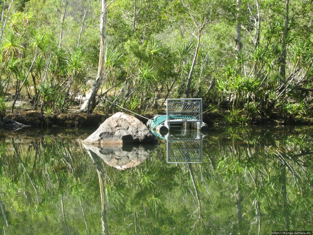 Робби обращает наше внимание на металлическую сетку на той стороне реки, оказывается, это приманка для крокодилов, куда сажают поросенка и опускают его в воду, чтобы туристы могли увидеть крокодила во всей его красе. Вокруг тишина, только слышны странные птичьи звуки как будто мяуканье котенка.