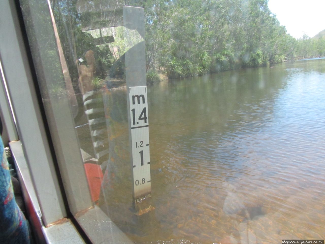 От Garnamarr едем еще километров 8 до стоянки машин. Дорожка здесь узкая, зигзагообразная и вся по песку, кое-где стыдливо засыпанному свежим гравием. Протреся все внутренности, доезжаем до знака «Fload Road» у речки и начинаем реальный медленный спуск в нее. Вдоль водного маршрута по обеим сторонам переезда воткнуты линейки с делениями, которые указывают степень затопления и высоту уровня воды в реке (максимальное значение – 1,4 м). На сегодняшний день уровень воды достигает полуметра, и мы благополучно минуем это препятствие.