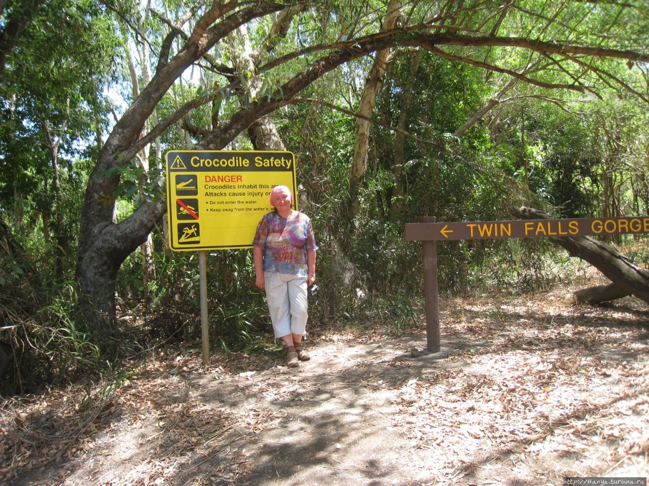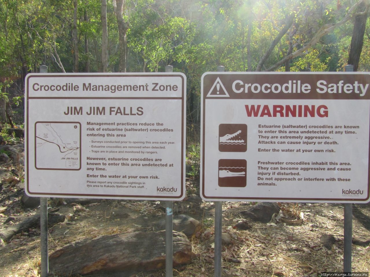 Стоянка автомобилей встречает нас знакомыми знаками, и мы шутим – вот ведь знаковая страна, на каждый чих есть плакат, и теперь уже нас не удивляет то, что в начале тура с нас взяли расписку о собственной ответственности за существующие риски путешествия! Вот и здесь нам было приятно узнать, что администрация парка прикладывает все усилия, чтобы снизить риск доступа солоноводных крокодилов на эту территорию, но при этом обращает внимание, что доступ в воду, т.е. купание, это дело ваше. А вот следующие плакаты мы только сфотографировали и в прекрасном неведении отправились в путь к водопаду.