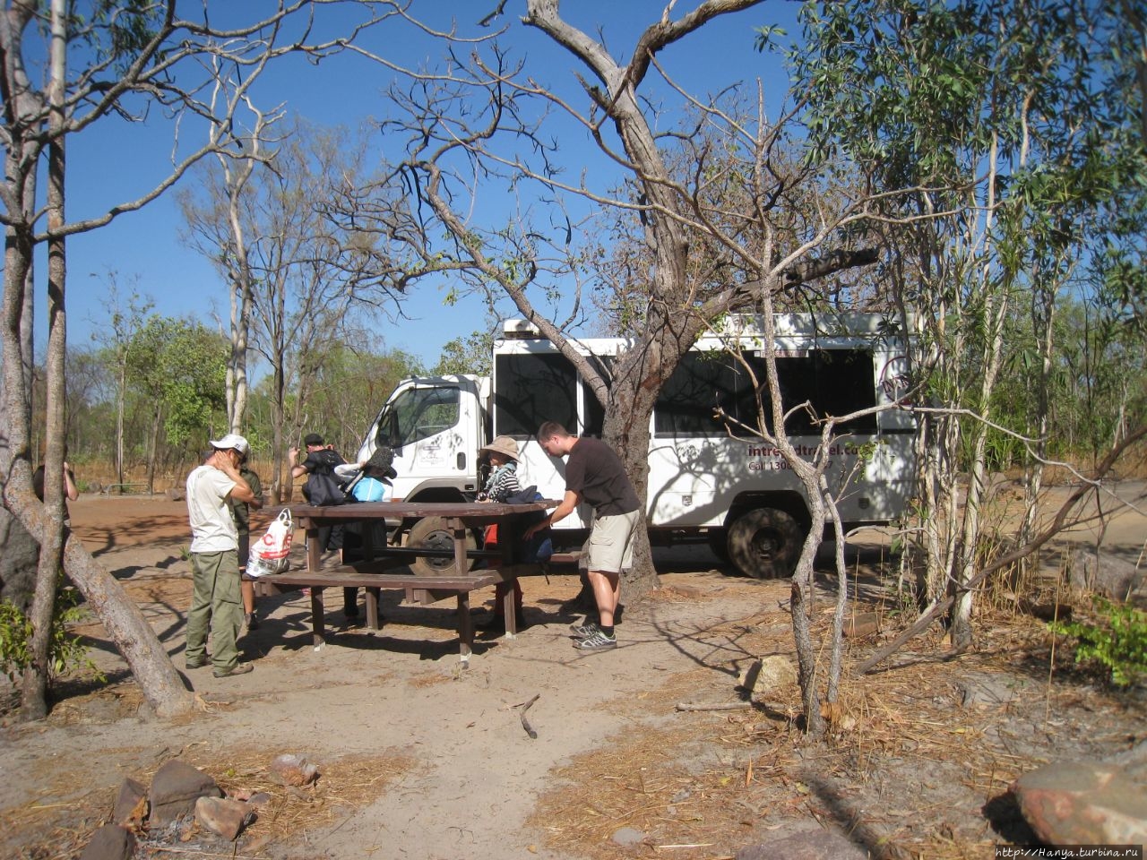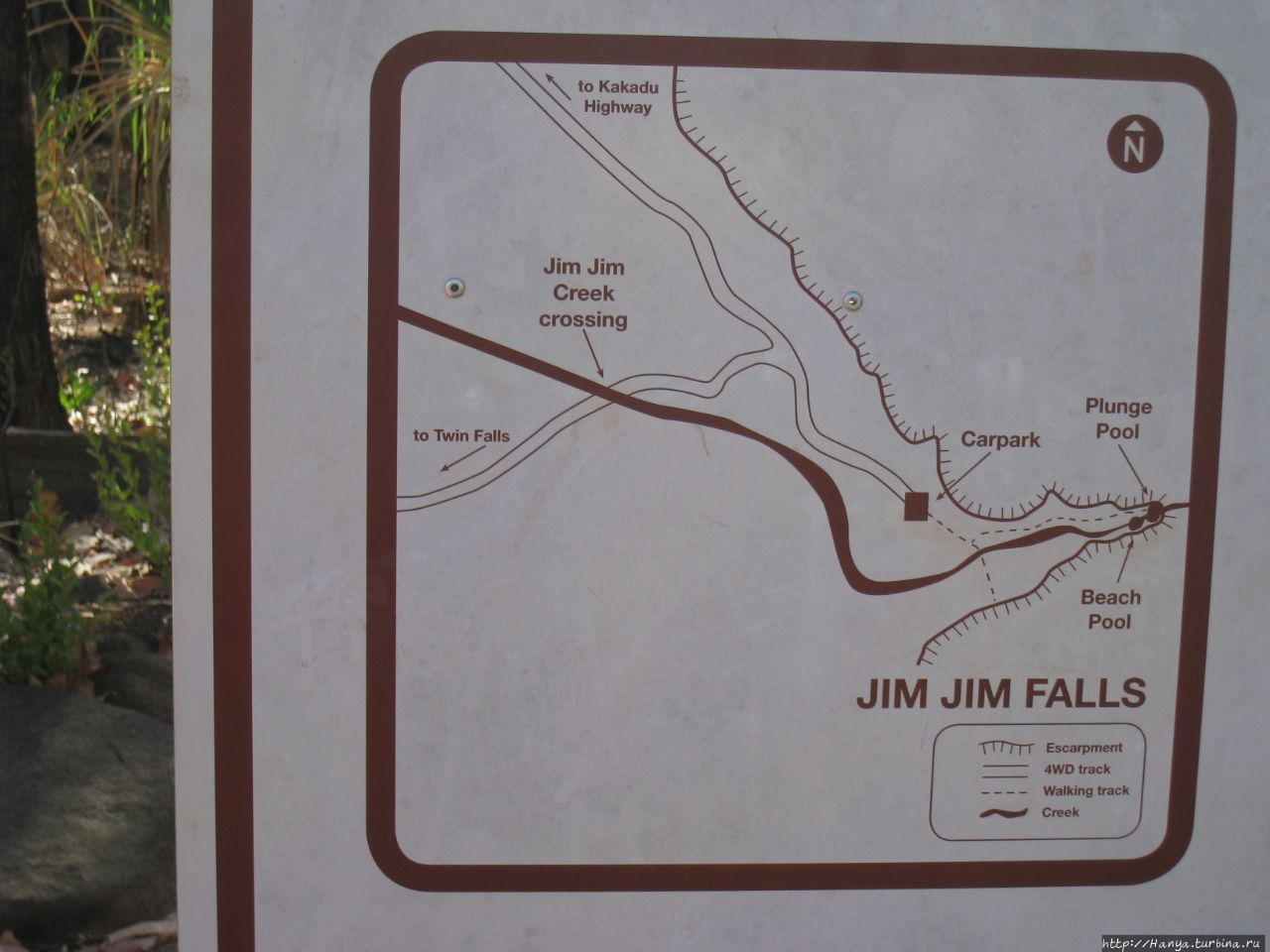 Пляшущие человечки-рентгены Убирр и закат на скале Надаб.Ч29) сегодня снова ранний подъем в 5.50, сборы, погрузка багажа, завтрак. Готовим стандартные гамбургеры для себя на перекус, убираем за собой, грузим кухонную утварь в машину, и стартуем в путь в 7.20. По программе у нас посещение водопада Jim Jim Falls, и мы почти повторяем вчерашний путь. Вначале едем по асфальтовой дороге часа 1,5, потом еще с полчаса по гравийной, пока не добираемся до так называемого базового лагеря Garnamarr, откуда стартуют все туры к двум водопадам Джим-Джим и Твин (Twin). .