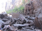 В обычной жизни я не занимаюсь спортом, и навыка спортивной ходьбы у меня нет, но я упряма и всегда дохожу, куда надо, только чуть позже коллег из-за своего более медленного темпа. Но каждый раз, когда этот темп слишком быстр для меня, я начинаю нервничать, что подвожу группу, и у меня сбивается дыхание, что добавляет усталости. Да еще мы несерьезно отнеслись к обуви, у меня были легкие спортивные тапки с открытой пяткой, что здесь категорически нельзя. Настоятельно советую одевать кроссовки с твердым задником и flexible подошвой, чтобы не повредить ноги. Мы вот потянули связки в стопе и лодыжке от бесконечных подтягиваний и прыжков вниз-вверх. Разве можно было предположить, что дальше будет еще хуже? Из-за высоты этих глыб трудно увидеть, что называется свет в конце тоннеля, и ты не знаешь, долго ли еще идти. Озвученные на щите 2 км, казалось, превратились во все 10!