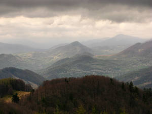 Через некоторое время тропинка довольно сильно пошла на спуск, и мы вышли из леса и к тому же оказались немного ниже прослойки облаков. Перед нами, можно сказать впервые, открылись уже вполне приличные виды. Здесь мы решили подольше перекурить и пообедать. Пелена облаков закрывала гору Блишню (1040 м), с которой мы спустились, но вдалеке уже отчетливо были видны долина реки Уж и гора Ясы.