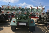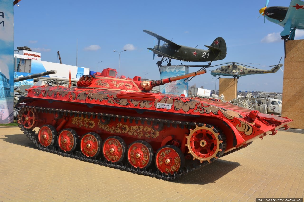 На выставке есть такие оригинальные экземпляры техники, как танк под "Хохлому" и пушка с росписью под "Гжель".