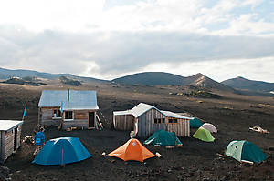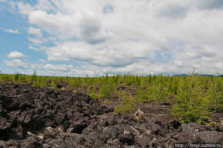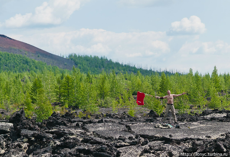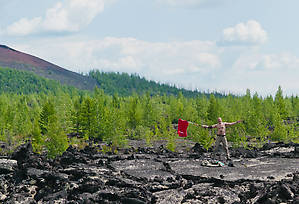 В первый день пошли на малый прорыв, там где лавовое поле простурается на киллометры, как в фильмах ужасов после конца света. Перед тем как туда идти успели по пути забратся поочередно на 2 небольших по Камчаыским понятиям конуса (вулкана) которым всего-то по 30 лет, как и мне! Лазила по вулканическим повестникам.