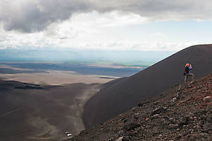 даже пар до сих пор идет из трещин. Забрались и на второй конус — тоже горячий нрав. Спускатся в обход было лень, сьезжали по прямой, по наклону в 50 градусов и покрытому лавовой пылью и камнями.