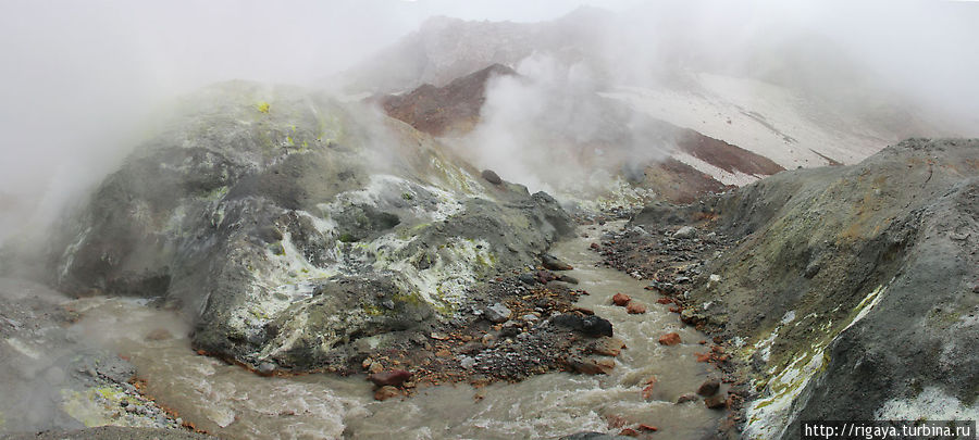 На следующий день погода не сильно поменялась только облачность поднялась. Памятуя вчерашний день, когда внизу были облака, а вершина была девственно чистой, пошли наверх на Мутновский. Кинув рюкзаки где-то посреди дороги в камнях побежали наверх налегке. Мутновский встретил нас мрачными пейзажами и одуряющими запахами. Только перевалив через кромку кратера, увидели первое фумарольное поле и сразу кинулись к ним… фотографировать). Продвигаемся по заметной тропке – проходим мимо кучи фумарол, кипящих луж, колодцев и всякой другой, трудно поддающейся классификации, проявлений жизни земли. Продвигаемся еще дальше и видим реку прямо из которой поднимается живая, дышащая стенка. Еще чуть дальше начинается ледник, озеро, которое мы ожидали увидеть не увидели, точнее увидели лед плотно его сковывающий. А вот кратер в котором гремело последнее извержение на Мутновке порадовал дымом, паром, грохотом, отвесными стенками… Полюбовавшись на всю эту жаровню спускаемся. Так до темноты еще есть время значит пробежимся к каньону Опасный. Водопад поразил все-таки 80м.(по некоторым описаниям), но больше поразил сам каньон – его масштаб, слоистые стены и яркие цвета. Появилось желание пройти его по низу, но это в следующий раз, т.к. подходящего снаряжения с собой попросту не было.