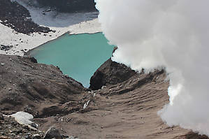 Утро… без всякого будильника просыпаюсь в 5 утра высовываюсь из палатки и замираю… Чистое голубое небо, кое-где на нашем уровне проплывают обрывки облаков, а внизу сплошная пелена. Хватаю фотоаппарат и на волю! Все остальные встают в 6 утра. Позавтракав лишь бутербродами с чаем отправляемся наверх. Идем по снежнику, которые заприметили еще с вечера. Далее небольшой осыпной взлет и мы возле первого кратера, рядом на склоне металлическая будка и антенны. Для чего антенны и будка предназначены остается только догадываться. Поднимаемся на кромку кратера, внизу небольшая лужица талой воды и снежник, а с противоположного склона срывается легкий дымок. Кратер хоть и не очень активен, но жив. Это наше первое знакомство с «живой» землей. По кромке устремляемся в сторону дымка. Уже на подходах ощущаем исходящую теплоту от земли – рукой касаешься, а земля теплая и парит. Полюбовавшись и наснимавшись вдоволь отправляемся дальше, мы помним, что где-то снизу нас пытается догнать облако. Спустившись с этого кратера, начинаем подъем к основной воронке – ее видно издалека т.к. такой столб дыма в округе один. Выходим к кромке первого, из двух соседних и самых больших кратеров Горелого (всего их 7 штук), и понимаем по какому обрыву мы ходили вчера в тумане... Внизу искрится и переливается пресное озеро. Бирюзово-сине-зеленые и еще множество неуловимых оттенков искрятся и сверкают на водной глади. Но пора идти дальше ведь оттуда доносится ни с чем ни сравнимый гул и грохот и поднимается столб дыма-пара. Подойдя ко второму кратеру замечем множество небольших фумарол по его стенкам. А также, большой провал из которого и поднимется дым-пар. Вся эта изумительная природная «машина» работает с оглушительным ревом вышвыривая из своего недра, наверное, половину таблицы Менделеева. Запахи, когда ветер дует в нашу сторону, тоже не особо хорошо переносятся. От серы режет глаза. А где-то внизу в самом жерле виднеется что-то красное постоянно меняющее форму – магма. Как выяснилось уже по приезду мы застали Горелый в довольно активной фазе, ребята пришедшие туда буквально через 5 дней даже дыма почти не увидели. И тут наконец-то догоняет нас облако, которое неотступно следовало за нами по пятам с самого утра. И снова дымка и снова спуск в тумане, но теперь то мы уже точно знаем куда идти!