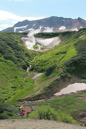 А на следущий день мы были уже у Дачных горячих источников, их еще называют Малой Долиной Гейзеров. Оно и понятно небольшая долинка, которая все парит, если присмотреться, кое-где вода с брызгами и шумом вырывается из под земли образуя небольшое подобие гейзеров. А рядом Мутновская ГеоЭС, мощность ее невелика, но это чистая энергия полученная из раскаленных недр земли.