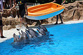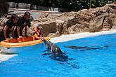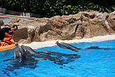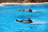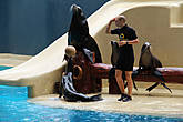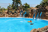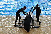 Шоу касаток заслуживает внимания уже потому, что не каждому зоопарку они по карману. Эти животные появились здесь в 2006 году. К их приезду построили новую арену, адекватную их размерам. В основном бассейне, где выступают касатки, 9 млн. литров регулярно обновляемой воды. Максимальный пробег, который животное может сделать вдоль его стеклянных стенок — 120 метров. Температура воды в любое время года поддерживается на уровне 13 градусов тепла. Вся поверхность бассейна покрыта специальной силиконовой пленкой,чтобы океанские акробаты не поранились. Касаток, как и дельфинов, кормят преимущественно сельдью, которую привозят с побережья Норвегии, где ее тщательно отбирают и замораживают до температуры минус 40 градусов. Ежедневно на прокорм дельфинов и касаток в Лоро парке уходит до 500 кг рыбы. Если захотите смотреть шоу с первых рядов — заранее позаботьтесь о накидке. "Опасные" места отмечены соответствующими наклейками. Двух одинаковых шоу не бывает даже в течение дня: касатки своенравны, поэтому дрессировщики подстраиваются под их настроение.