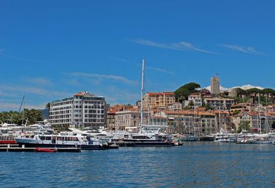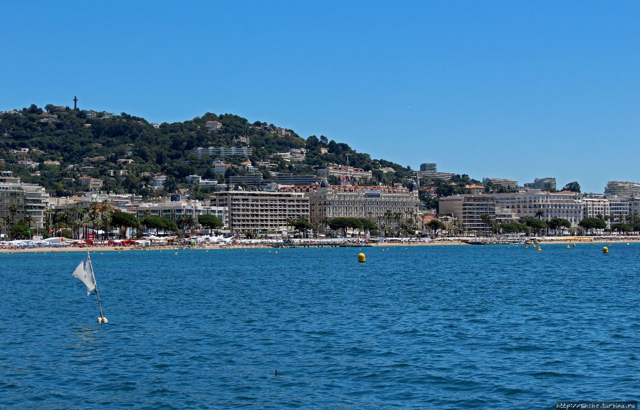 На востоке набережная Круазет завершается мысом Палм-Бич, а на западе Дворцом Фестивалей, за которым виднеется холм Le Suquet — старая часть города Канны.