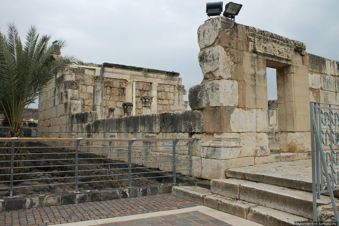 Гораздо интересней полюбоваться Белой Синагогой, построенной в 3-4 веке нашей эры. Стоит она на развалинах более старой синагоги, где проповедовал Иисус. Развалины новой Синагоги выглядят впечатляюще. Стены, колонны — все это изготовлено из белого камня и резко выделяется на фоне развалин остальных зданий из черного базальта.