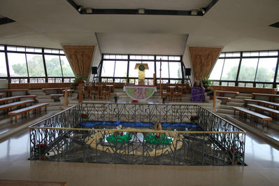 Совсем рядом находится церковь Святого Петра. Изначально церковь стояла у самого берега и вода озера омывала его стены. Сейчас озеро обмелело и рядом с церковью появился пляж. При мне в церкви была очередная туристическая группа. Экскурсовод рассказал душещипательную историю после которой народ валом повалил обмочить свои ноги в озере. Думаю они получили блаженство. Мне от незнания осталось только посетить церковь и как и в предыдущей церкви насладиться аскетизмом интерьера. Весь взор обращен на главный элемент церкви — большой камень скала, на котором Иисус разделил с учениками трапезу хлеб и рыбу, пойманную по его совету. Здесь же он объявил о назначении Симона Петра первосвященником, первоапостолом, то есть первым главой своей церкви.
