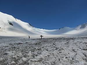 У Сереги у опытного нашего гида был бинокль, через него он увидели что выбранный нами ледник не пригоден для катания, на поверхности ледника было большое количество камней. Просмотрев все ближайшие ледники , мы решили не много вернуться и идти на другой .
