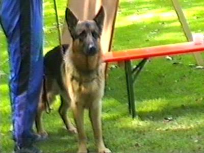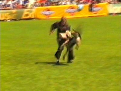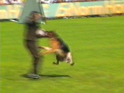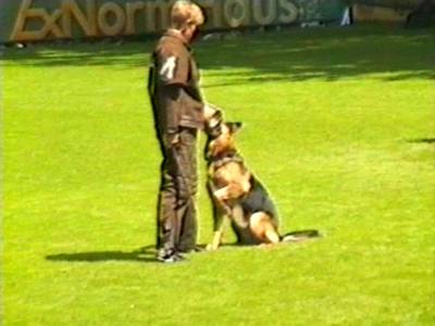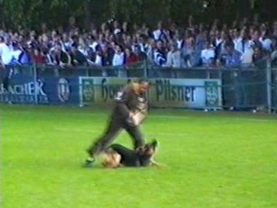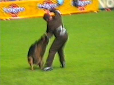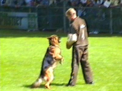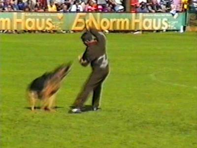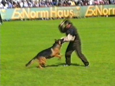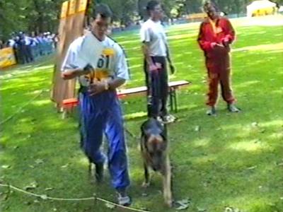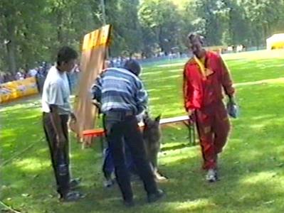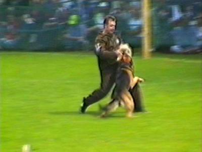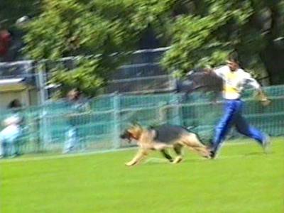 Видеосъёмка позволила получить довольно интересные стоп-кадры, которые невозможно заснять обычным фотоаппаратом. Попытаюсь прокомментировать эти кадры. На снимке 2 видна напряженная борьба собаки с фигурантом. Видно, как изогнулся стек, и собака успешно выдерживает удары. В кадре 3 удачно запечатлена атака «влёт». Видно, что собака «летит» по воздуху. Кадр 4 хорош как учебное пособие по безукоризненному «аусу». Видно, что собака только что отпустила рукав, внимательно следит за фигурантом, и даже приподняла левую лапу, фиксируя любое возможное движение фигуранта, после чего атака может быть продолжена. Я впервые увидел такой «аус» и аплодировал собаке, как и многое зрители на трибунах.