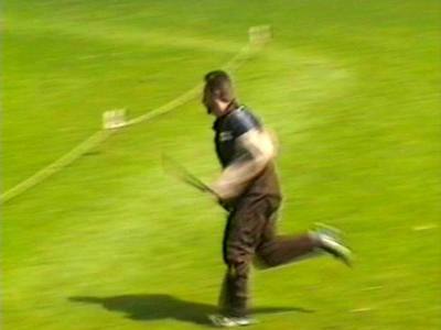 В кадре 6 зафиксирован фрагмент борьбы, когда фигурант «навис» над собакой, осуществляя физическое и моральное давление. А кобель прекрасно выдерживает это давление. А на кадрах 7 и 8 зафиксирована неудачная атака. Кобель промахнулся при атаке и слетел с рукава. В результате он беспомощно распластался на траве. Потом он продолжил атаку, но было уже поздно – судья снял его с дальнейших испытаний. На кадрах 9-12 запечатлены различные моменты лобовой атаки. Видно как кобель стремительно атакует (кадр 9), после хватки он выплясывает «дорожку» (кадр 10). Фигурант разворачивает собаку, имитируя удары стеком (кадр 11), но собака не отпускает и держит рукав полной пастью (кадр 12).