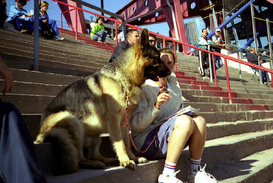 Потом мы походили по торговым палаткам. Ирина купила себе ежедневник с полезной собачьей информацией, а также собачью косметику на завтрашний день. Из компьютерной распечатки мы узнали, что сука Карины оказалась в четвертом ринге, и мы снова пошли за неё болеть. Там собрались многие русские собаководы, так как Карина не последний человек в овчарочьем "бомонде". Мы искренне болели за каждую "русскую" собаку, особенно за собак тех владельцев, которых лично знали. Так, ещё в пятницу, я очень обрадовался, когда случайно увидел, как проходила проверку поведения Улла, собака российского разведения. О том, что она русскоязычная собака, я узнал по неистовой команде "Дай!" вместо привычного здесь немецкого "Аус!", которая раздалась над стадионом во время проверки поведения. Я даже вздрогнул, и увидел, как чётко исполнила команду Улла! Знай наших!