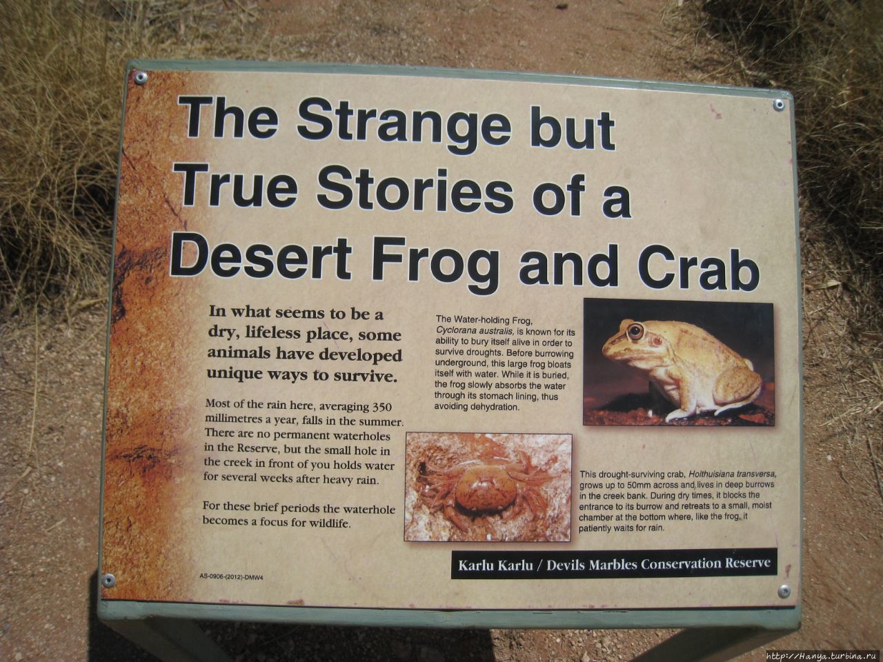 Удивительно, но в таких безлюдных и безводных местах тоже есть живность. Как и в чилийской пустыне Атакама, здесь сумели выжить и приспособиться отдельные виды флоры и фауны. Почти все из 350 мм годовых осадков выпадают здесь летом, и в этот период активизируется некая жизнь, в т.ч. Water-holding frog Cyclorana австралийская, или лопатница (лягушка-водонос). Это уникальное земноводное способно впитывать через кожу воду, принимая шарообразную форму. Также здесь могут выживать пустынные (сухопутные) крабы, которые буквально запечатывают себя в глубокой норе, в которой они могут поддерживать водный баланс длительное время, терпеливо ожидая периода дождей. Кроме представителей фауны, некоторая часть флоры также может запасать воду и выдерживать длительную засуху. Один из видов – это хлопчатник Стёрта, или Пустынная роза Стёрта (Gossypium sturtianum) из семейства мальвовых. А еще там растет инжир и дикие бананы буша, но нам их увидеть не представилось возможным.