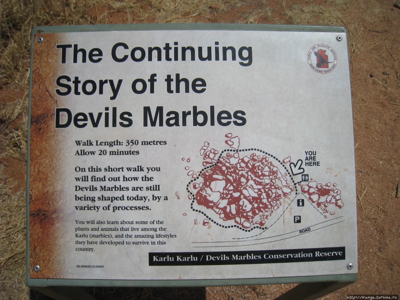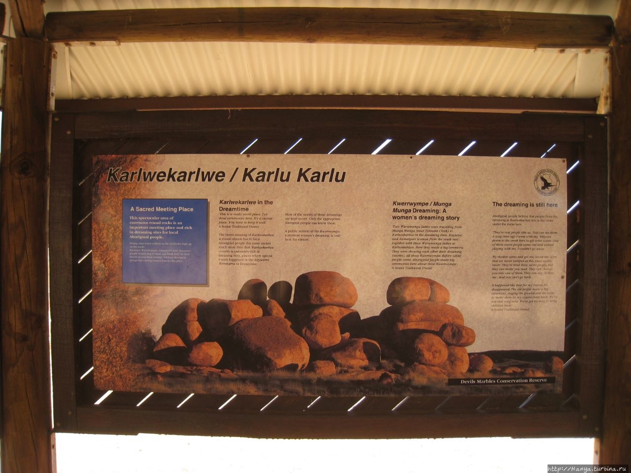 Монотонная дорога и санстопы как часть австралийского трипа.) и едем к первому сегодняшнему туристическому объекту, и это — Камни (Шары) Дьявола или Karlu Karlu на языке аборигенов. Это тянущаяся несколько километров по обе стороны шоссе цепочка гранитных глыб, которые аборигены считают яйцами мифического Радужного змея. Приехав сюда, вы окунаетесь в так называемое «сонное время» (Dreamtime), а само место является церемониальным и священным для аборигенов. В переводе с аборигенского Karlwekarlwe формально означает круглые камни, но его духовное значение гораздо шире.