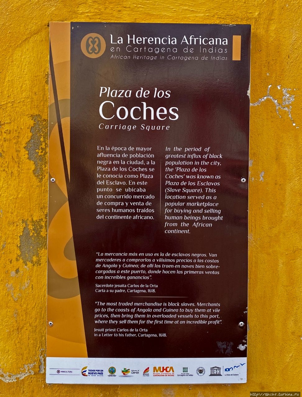 Эту площадь можно считать первой в Картахене. Вначале на ней был устроен рынок рабов, прибывавших в порт Картахены из Африки. Отсюда первое название площади — "Plaza del Esclavo" — "Площадь невольников". Уже в 1585 году она стала просто "Plaza de Mercaderes" — "Рыночная площадь".