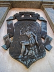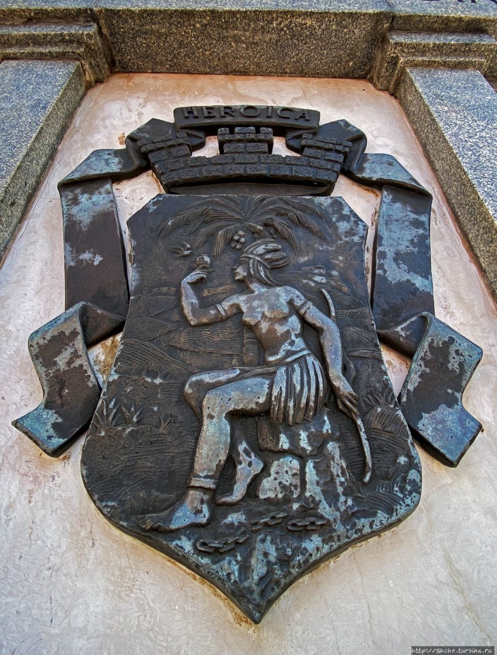 На высоком постаменте можно увидеть гербы города...