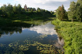 Из Вышнего Волочка в Калязин по трассе Р85/Р86), встретил нас поэтическим видом на заросшую илом, кувшинками и камышом речку Кашинку. На высоком берегу реки возвышался симпатичный кирпичный храм с зелеными луковками, часть из которых была погнута или находилась в ремонте. Смотрелся этот вид ничуть не хуже чем его более известный записной дружок в Торжке (