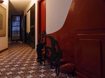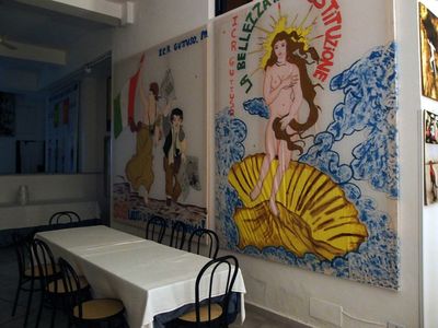 Один только печальный момент, который трудно объяснить тягой к нестандартному и неординарному, заключался в том, что кровати в отеле все с пружинными матрацами. Ну, такими...как в 70-х. Выспаться на таком твердом и неровном ложе нам, принцессам и принцам "на горошине" довольно проблематично. Так что приходилось крутиться полночи, рассматривая в свете ночника какой-нибудь из многочисленных замысловатых шедевров, украшающих стены ))