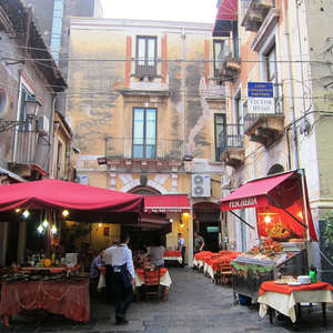 Прямо за фонтаном – рыбный рынок. Но он работает только утром, а сейчас, когда все закрыто, без рыбы, овощей и рекламы, место выглядит серым и мрачным. Серые дома, серые арки и даже мостовые вымощены все тем же серым вулканическим камнем.