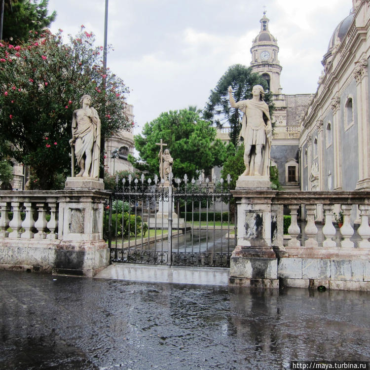 Ух ты! Вот это шедевр! Каждое здание – чудо чудное! И, если Сиракузы, Таормина и Джардини-Наксос напоминали скорее о Греции, чем о Италии. То тут — Италия в чистом виде. Забудьте о греках-прародителях. Никаких намеков ни архитектурных, ни стилистических. Созданный ансамбль, ну просто римская площадь Навона. Как оказалось, для этого есть веская причина: архитектор Джованни Батиста Вакарини, уроженец Палермо, уехал учиться в Рим. Там он влюбился в творения Барромини и, вернувшись на родину, создал в Катании шедевры, не уступающие римским. И начать я хочу с фонтана. Вот он, созданный из лавы черный слон. Став символом Катании, он делает честь своему создателю и несет на спине, как водится, египетскую стеллу. Но слон, относительно маленький, а фасад Дуомо очень даже большой. Кроме фонтана и Собора на площади есть еще работы Вакарини: живописный монастырь св. Агаты (копия работы Барромини), сенаторский дворец (теперь там мэрия) и еще один фонтан Аменано, впрочем, этот фонтан, кажется, другого автора.