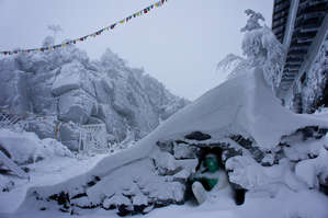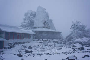 Мы прибыли в Качканар в 18 часов, уже затемно. С надеждой глядя на небо и различая звёзды в разрывах облаков, я планировал хорошенько поснимать на рассвете. К сожалению, ожидания не оправдались, утром вершина и монастырь оказались погружёнными в облако, поэтому фотографии получились в стиле "ёжики в тумане". Думал сделать их чётче и контрастнее, но не стал, смотрите как есть. Так оно всё и было.