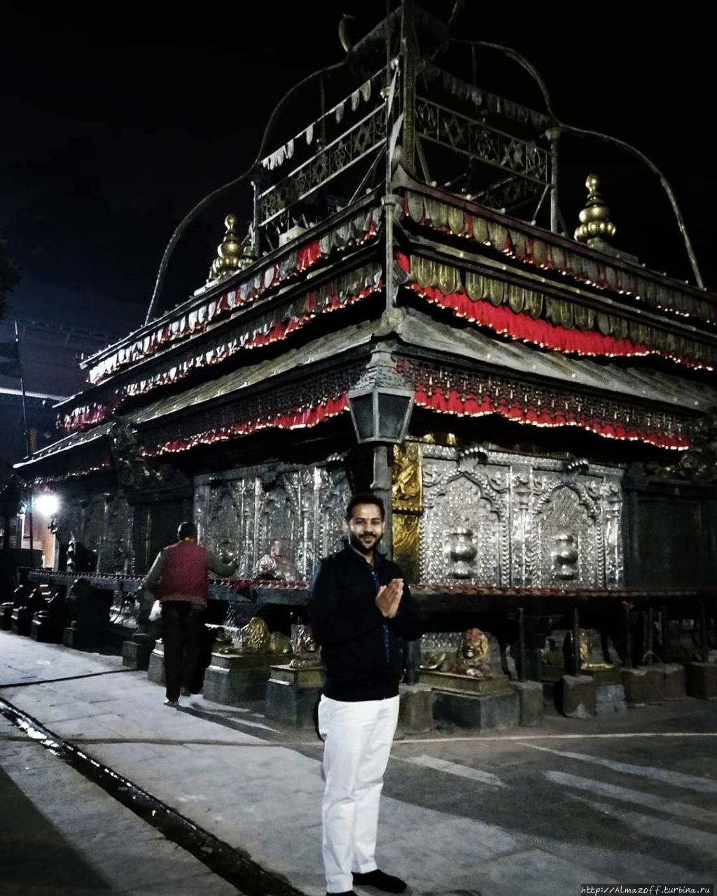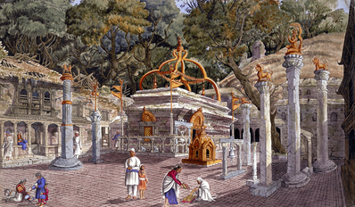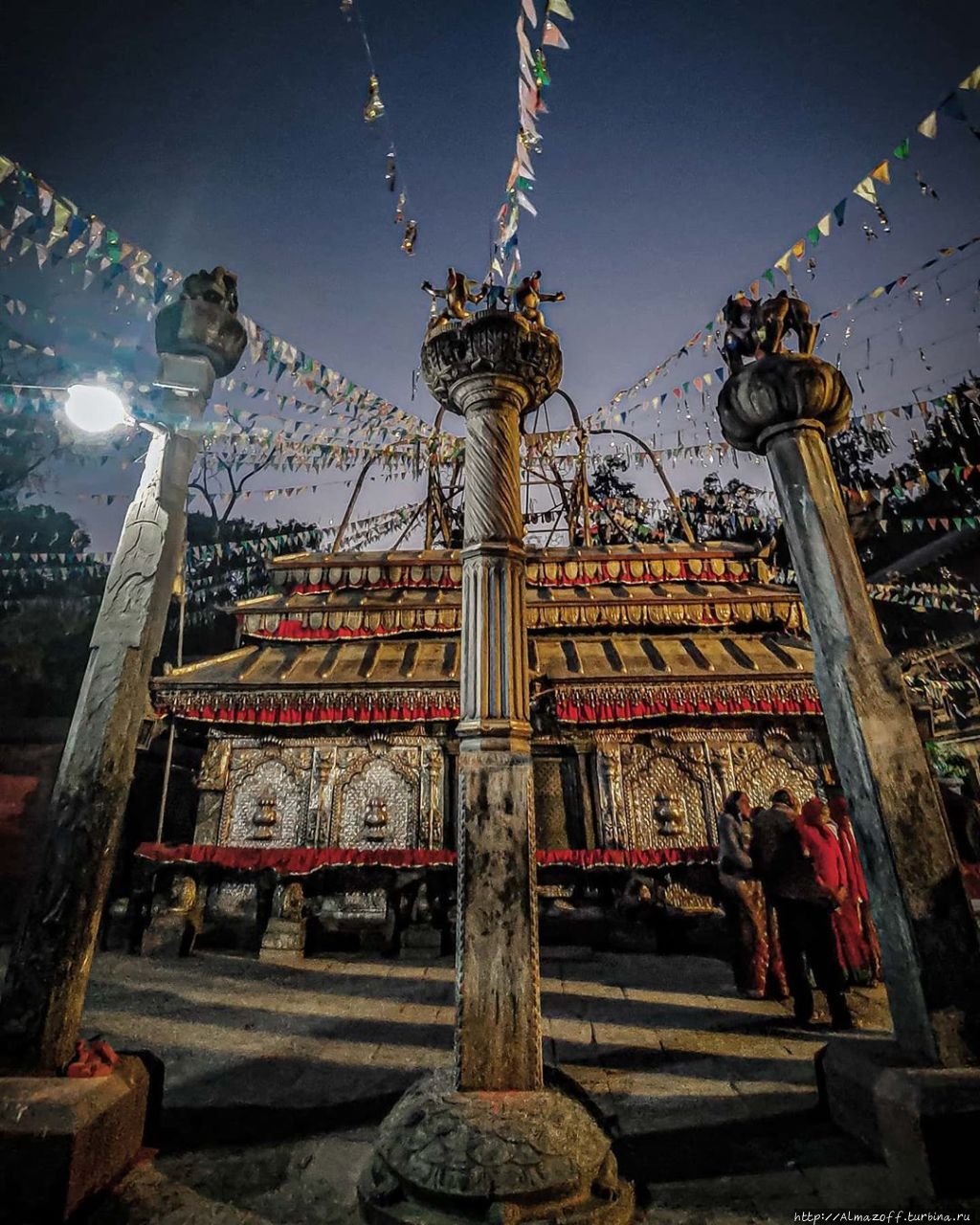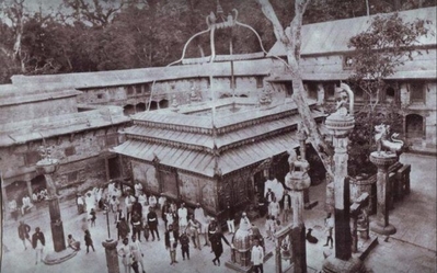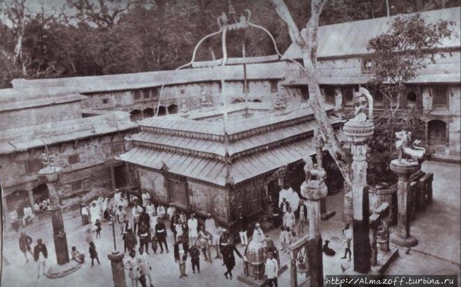 Пашупатинатх на реке Багмати – центр духовной энергии. Ч.138:"Центральный храм Бога Шивы с двухъярусной медной крышей с золотым покрытием в виде пагоды со шпилем был построен в 17 веке для сохранения и поклонения главной святыне – каменному лингаму (вертикальному черному камню высотой в метр) с изображениями лика Шивы по 4-м сторонам света и пятым, направленным вверх. Интересен факт, что предыдущий лингам был уничтожен в 14 веке в ходе мусульманского вторжения.