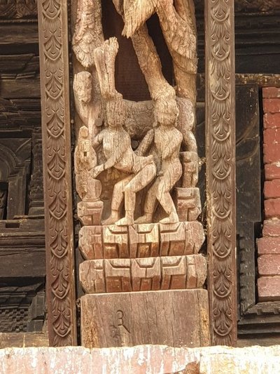 Есть здесь и эротическая резьба у основания стоек, которую наш гид показывает нам с особой настойчивостью. Фигурки маленькие, да и сколько им уже лет, а нас после эротических храмов индийского Кхаджурахо разве можно удивить?