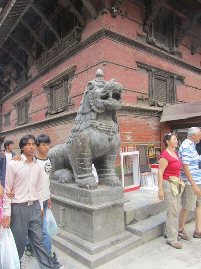Ganga Path выводит нас к внешней стене Лохан Чоук, и здесь, возле башни Патан, улицу стерегут два мифических дракона, возле которых в очередь фотографируются туристы.