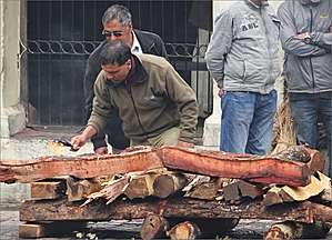 Наступает заключительный этап с посыпанием пудрой и церемонией обноса тел несколько раз вокруг аккуратно уложенных поленниц. Их укладывают заранее определенным образом из чуть красноватых дров, специально подготовленных для этой цели. Кто-то деловито поджигает дрова, вспыхивает солома, укрывавшая оранжевое одеяние, и вот уже ощутимый носом погребальный седой дым начинает застилать всю округу.