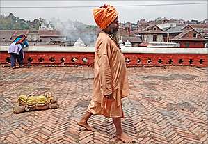 В комплексе я обнаружила две группы «садху», разделившие между собой территории влияния. В одной – примечательная троица, описанная выше. В другой явным лидером был интеллигентный, тоже далеко не непальской внешности мужчина, сразу учуявший мой безденежный интерес. Он демонстративно встал, закрыв своей спиной как амбразуру своих живописных друзей.