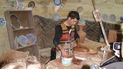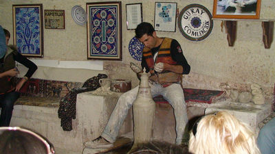 В Каппадокии много керамических мастерских, но большинство из них существуют лишь для целей производства с последующей продажей. Нас привезли в одну из них, где производство и продажа совмещены с шоу для туристов. В самом деле, где вам удастся воочию увидеть процесс появления глиняной вазы или тарелки. А тем более, самому поучаствовать в этом процессе! Это — довольно весело. Вам наденут специальный фартук, научат ногой крутить станок, руками лепить сосуд, который вы сможете даже забрать с собой! Все это под шутки и смех! Воспользуйтесь такой возможностью!