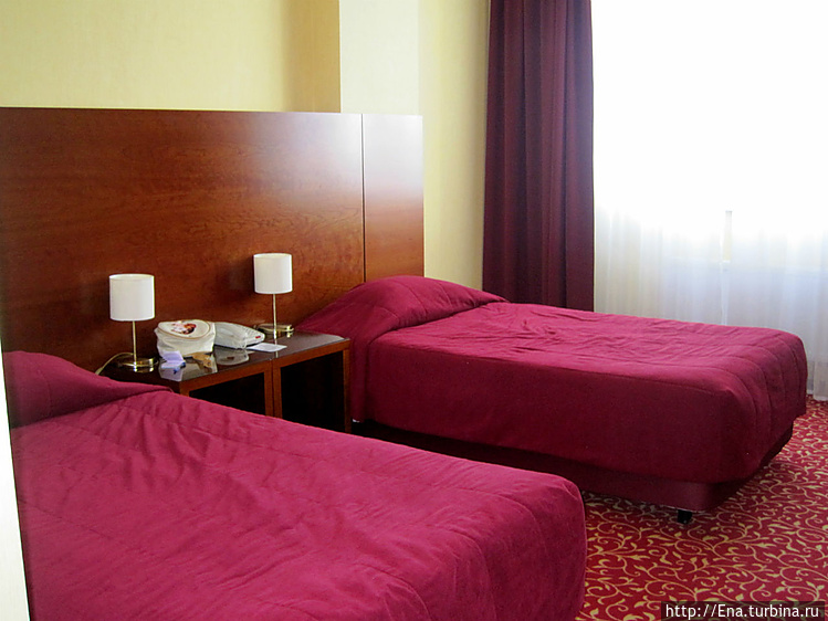 Нам достался стандартный номер 719 на 7 этаже. Просторный, стильный, зеленоватые обои на удивление гармонируют с малиновым ковролином и мебелью в бордово-коричневых тонах.