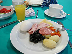 В стоимость номера входили завтраки, которые предлагались в ресторане гостиницы на втором этаже по системе «шведский стол». Просторный зал, столы под тяжелыми скатертями, стулья, очередная наряженная елка, играет ненавязчивая музыка. Обслуживание быстрое и предупредительное. Меню вроде бы разнообразное. Прикольнула кофемашина, я брала различные виды кофе, но так и не смогла отличить капучино от эспрессо, по-моему, автомат делает их одинаково. Ну, да ладно, я же не дегустатор xD :). На завтрак: вареные овощи (картофель, брокколи, морковку – очень вкусненькая), оливки, свежие и маринованные помидорки и огурчики (утром 1 января это было весьма кстати), сыр, яйца, сосиски, ветчина. Еще были каши, мюсли, хлопья, выпечка, тортики всякие. Чай, соки. В общем, можно было объесться, все так сытно, вкусно и обильно!